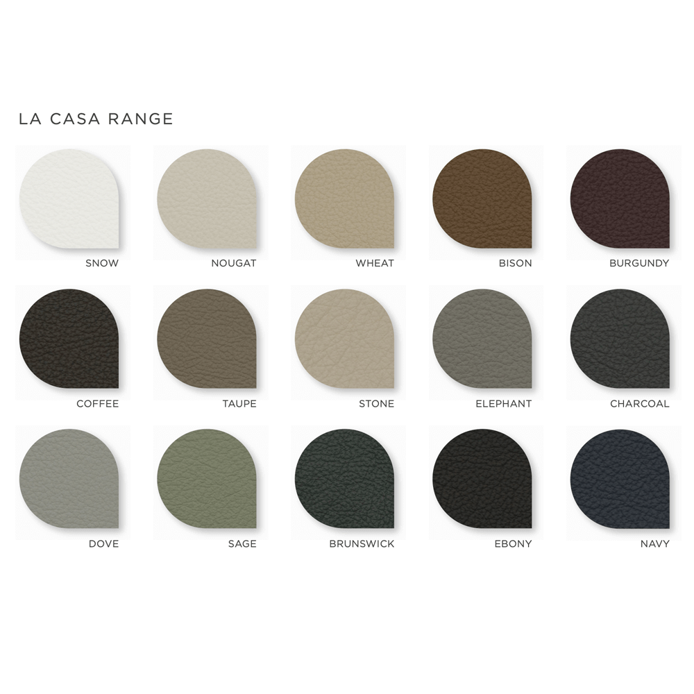 La Casa is a luxurious artisan leather with a soft glove-like texture, will retain their unique suppleness, provided they are regularly cared for. The leather is produced and tested to international standards for properties such as rubbing, flex resistance, light fastness, thickness, and strength.